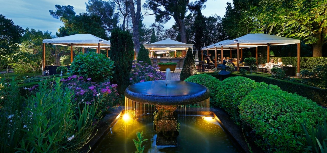 In winter, the restaurant rooms are spacious and bright with a unique view on the extraordinary garden. With warm weather, service takes place on the terrace overlooking the gardens, in the shade of the century-old chestnut and pine trees.