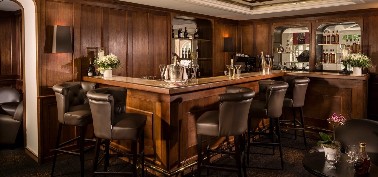 An inner bar in a cosy and elegant British club setting where one can listen to live music while sipping cocktails or liqueurs.