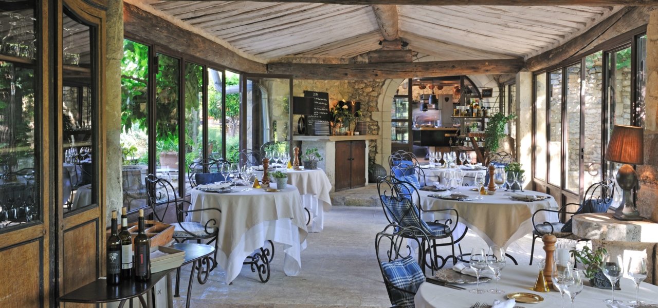 Enjoy lunch on the terrace with its pebble paving in the leafy shade of a lime tree or a luxuriant virgin vine, and let your gaze wander over the little wall into the huge vineyard. Make the most of the evenings lit up by lanterns, in the shelter of an arbour made by a local wrought iron craftsman. Ah, those little pleasures in life! On cool evenings, you can relish a delicious dinner happily installed in the restaurant's indoor dining room. Rough, exposed stone walls and an exposed beam ceiling give the place a simple, welcoming feel. The tables laid out with delicate china on a grey-beige linen tablecloth convey sober refinement… a delightful understatement that enhances the highly colourful cooking.